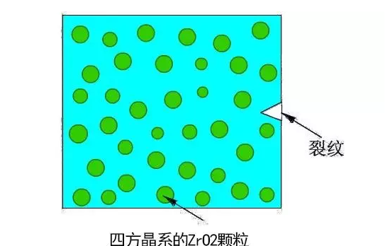 四方相氧化鋯受外力(溫度和應(yīng)力)的影響,氧化鋯從四方結(jié)構(gòu)向單斜結(jié)構(gòu)轉(zhuǎn)變時(shí)產(chǎn)生效應(yīng),吸收破壞的能量,抑制裂紋的變化和延伸。此變化稱為馬氏體轉(zhuǎn)變??煞譃闊衫鋮s過程中相變和使用過程中相變,前者是溫度誘導(dǎo),后者是應(yīng)力誘導(dǎo)。